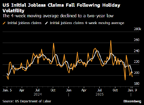 根据美国劳工部周四公布的数据,截至1月10日当周,首次申领失业救济人数减少9000人,降至19.8万人。这一数字低于对经济学家调查所得的所有预期。
