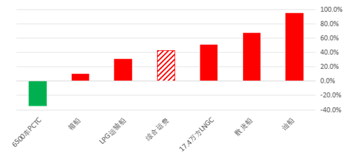 从海运贸易的结果看,量距齐增是本轮复苏的关键,运费在此种环境下大幅走高、回落、波动在相对高位。2025年12月综合运费收报3.19万美元/天,同比上涨42.6%。主力船型中,仅汽车运输船大幅回落,油船、LPG运输船、LNG运输船、集装箱船、散货船运费均同比大幅增长。特别是油船、散货船、大型LNG运输船涨幅超过综合均值。当前综合运费比十年均值高出近50%,比近3年均值高出17%。