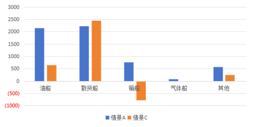 情景C-严苛环境,即经济、海运需求保持情景A条件,船队更新参考更为不积极的船舶存活概率模型。)