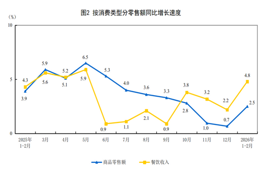 按消费类型分,1—2月份,商品零售额75815亿元,同比增长2.5%;餐饮收入10264亿元,增长4.8%。