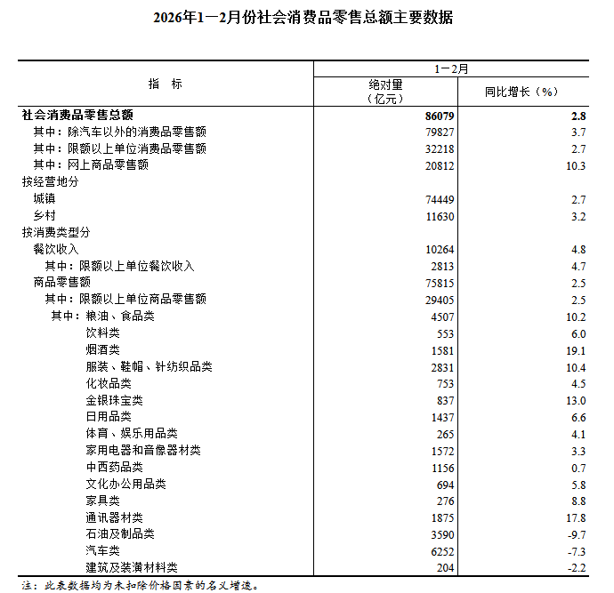 3月16日,国家统计局发布,1-2月份,社会消费品零售总额86079亿元,同比增长2.8%。其中,除汽车以外的消费品零售额79827亿元,增长3.7%。