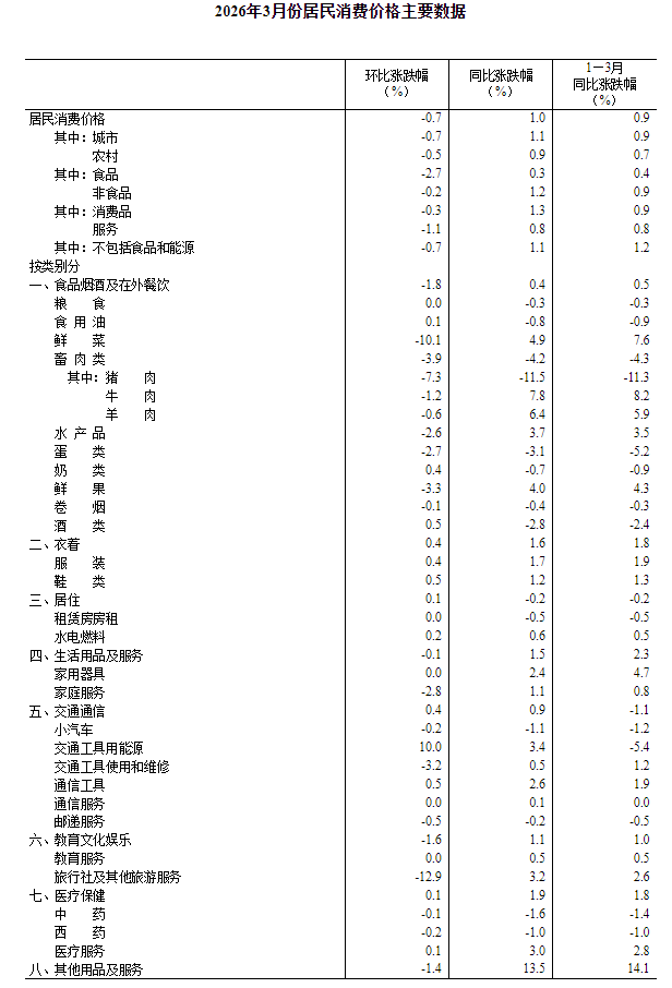2026年3月份,全国居民消费价格同比上涨1.0%。其中,城市上涨1.1%,农村上涨0.9%;食品价格上涨0.3%,非食品价格上涨1.2%;消费品价格上涨1.3%,服务价格上涨0.8%。1—3月平均,全国居民消费价格比上年同期上涨0.9%。