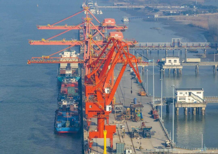 工人在江苏泰州港国际集装箱码头作业。汤德宏/人民图片